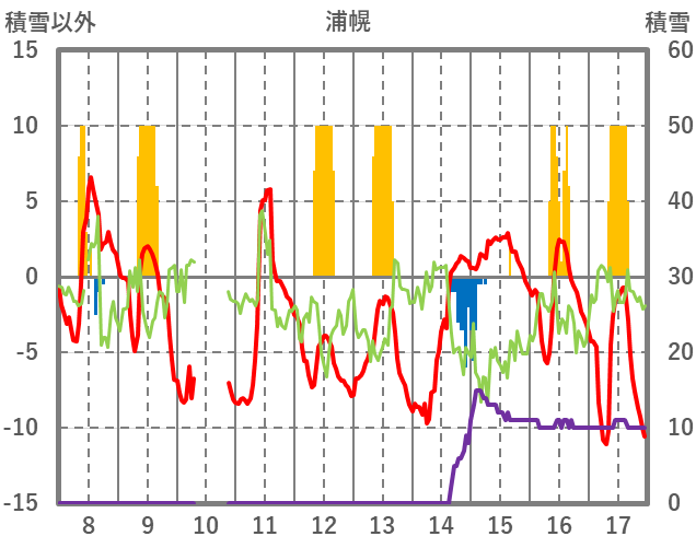 | 日 | 時 | 気温 | 降水 | 風向/風速 | 日照 | 積雪 | 降雪 |