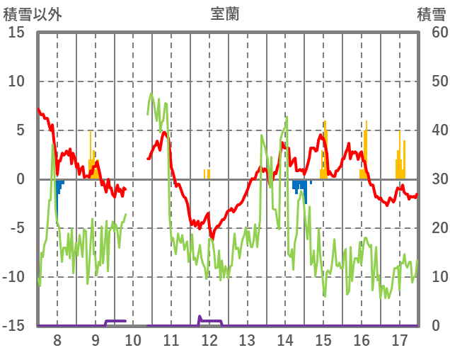 | 日 | 時 | 気温 | 降水 | 風向/風速 | 日照 | 積雪 | 降雪 |