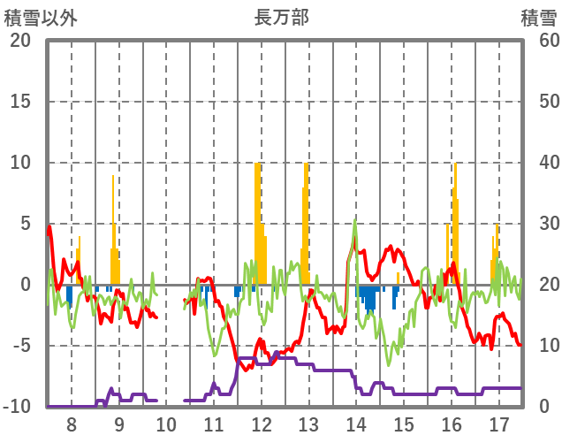 | 日 | 時 | 気温 | 降水 | 風向/風速 | 日照 | 積雪 | 降雪 |