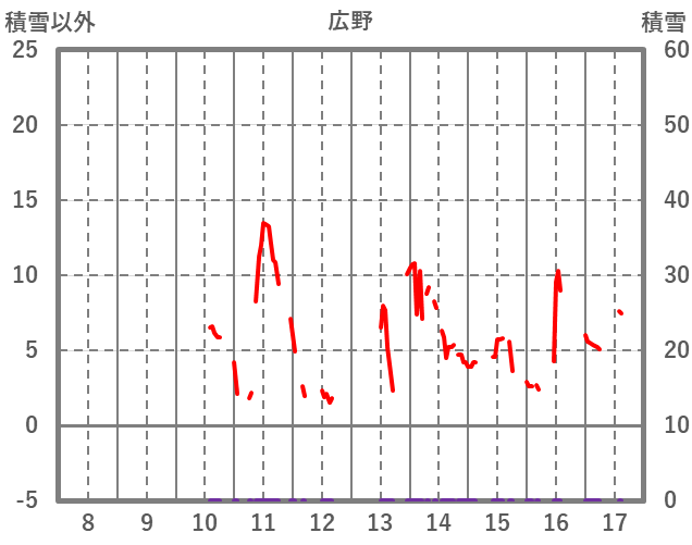 | 日 | 時 | 気温 | 降水 | 風向/風速 | 日照 | 積雪 | 降雪 |