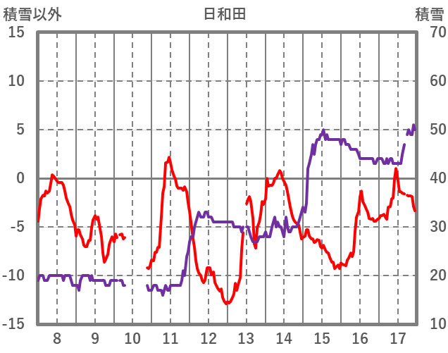| 日 | 時 | 気温 | 降水 | 風向/風速 | 日照 | 積雪 | 降雪 |