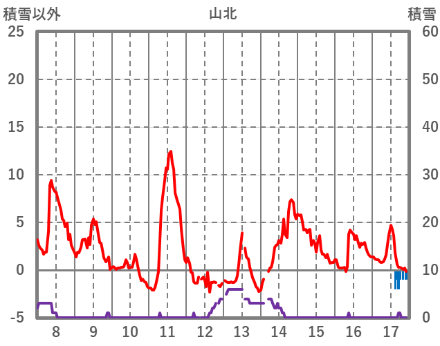 | 日 | 時 | 気温 | 降水 | 風向/風速 | 日照 | 積雪 | 降雪 |