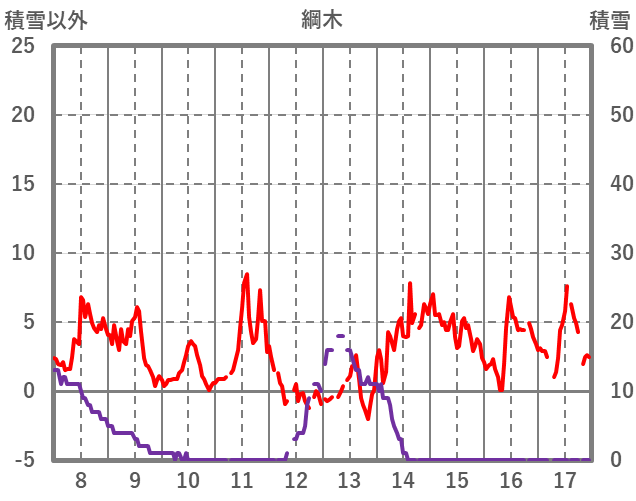 | 日 | 時 | 気温 | 降水 | 風向/風速 | 日照 | 積雪 | 降雪 |