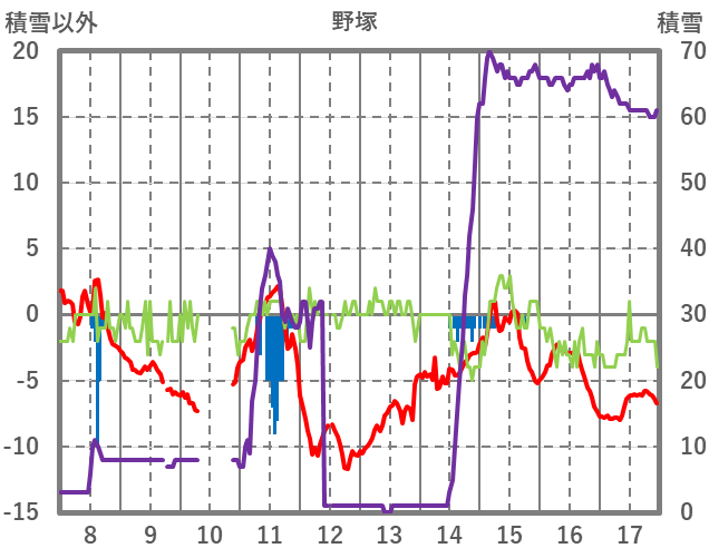 | 日 | 時 | 気温 | 降水 | 風向/風速 | 日照 | 積雪 | 降雪 |