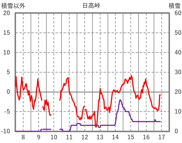 | 日 | 時 | 気温 | 降水 | 風向/風速 | 日照 | 積雪 | 降雪 |