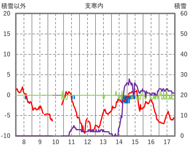 | 日 | 時 | 気温 | 降水 | 風向/風速 | 日照 | 積雪 | 降雪 |