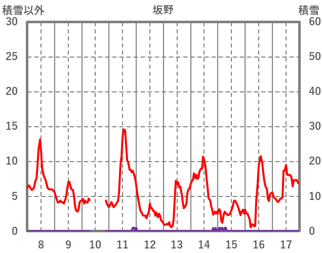 | 日 | 時 | 気温 | 降水 | 風向/風速 | 日照 | 積雪 | 降雪 |