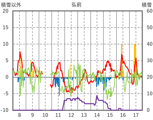 | 日 | 時 | 気温 | 降水 | 風向/風速 | 日照 | 積雪 | 降雪 |