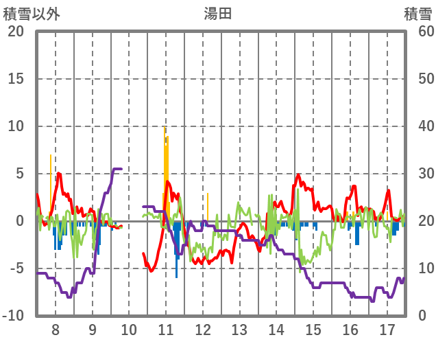 | 日 | 時 | 気温 | 降水 | 風向/風速 | 日照 | 積雪 | 降雪 |