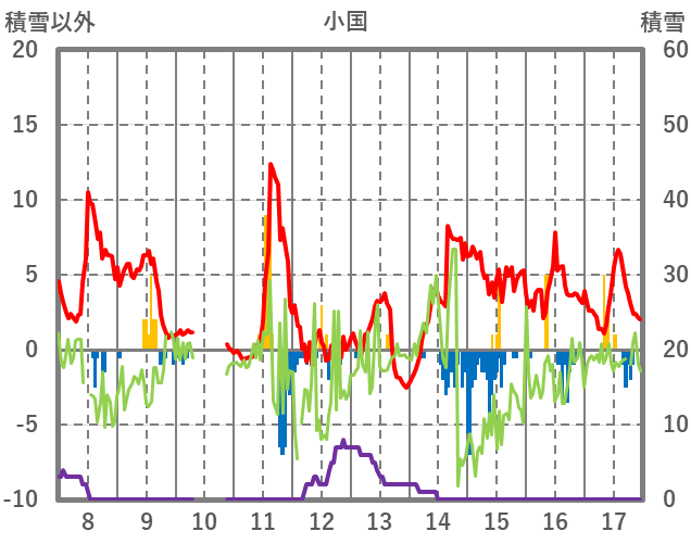 | 日 | 時 | 気温 | 降水 | 風向/風速 | 日照 | 積雪 | 降雪 |