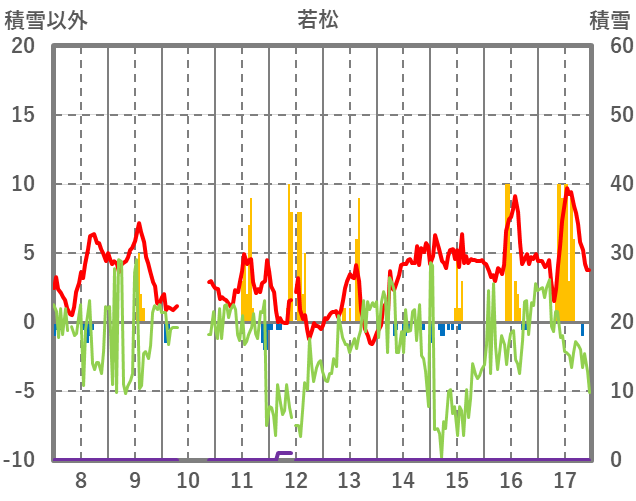 | 日 | 時 | 気温 | 降水 | 風向/風速 | 日照 | 積雪 | 降雪 |
