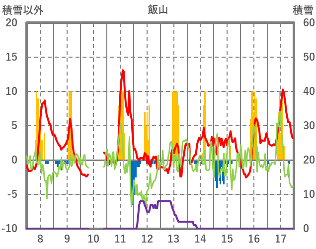 | 日 | 時 | 気温 | 降水 | 風向/風速 | 日照 | 積雪 | 降雪 |