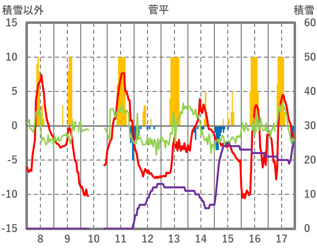| 日 | 時 | 気温 | 降水 | 風向/風速 | 日照 | 積雪 | 降雪 |