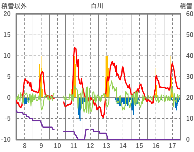 | 日 | 時 | 気温 | 降水 | 風向/風速 | 日照 | 積雪 | 降雪 |