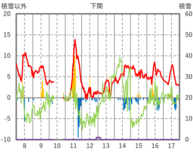 | 日 | 時 | 気温 | 降水 | 風向/風速 | 日照 | 積雪 | 降雪 |