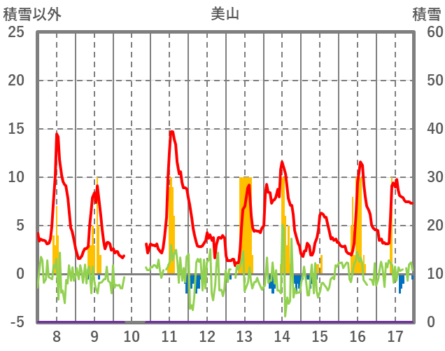 | 日 | 時 | 気温 | 降水 | 風向/風速 | 日照 | 積雪 | 降雪 |