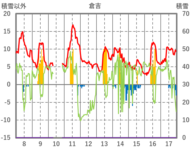| 日 | 時 | 気温 | 降水 | 風向/風速 | 日照 | 積雪 | 降雪 |