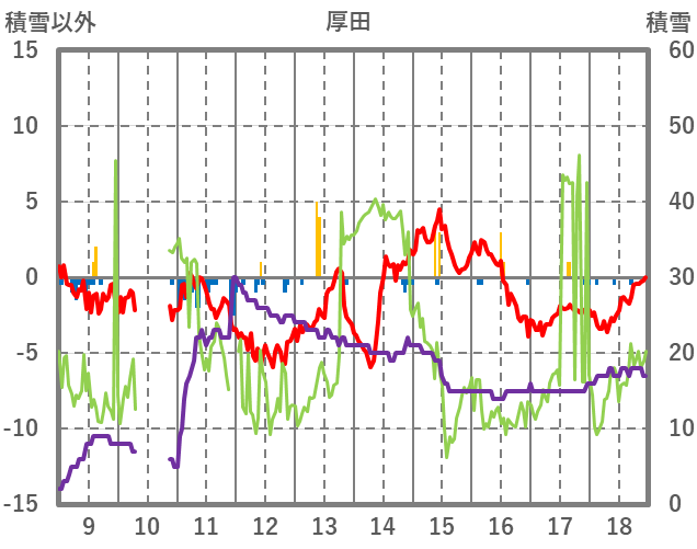 | 日 | 時 | 気温 | 降水 | 風向/風速 | 日照 | 積雪 | 降雪 |