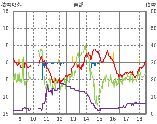 | 日 | 時 | 気温 | 降水 | 風向/風速 | 日照 | 積雪 | 降雪 |