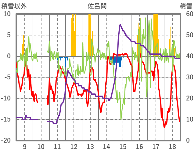 | 日 | 時 | 気温 | 降水 | 風向/風速 | 日照 | 積雪 | 降雪 |