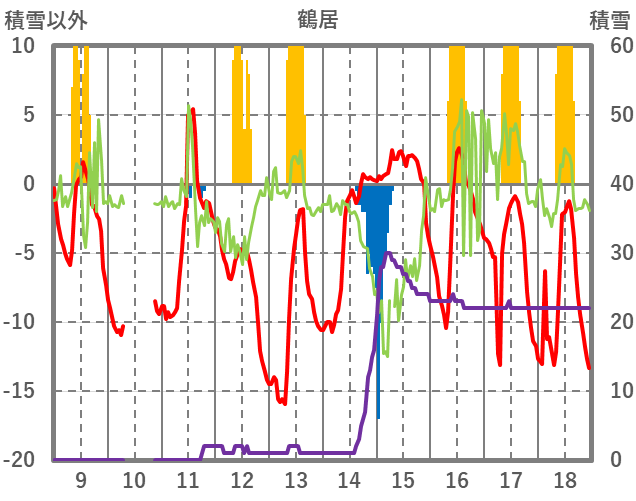 | 日 | 時 | 気温 | 降水 | 風向/風速 | 日照 | 積雪 | 降雪 |