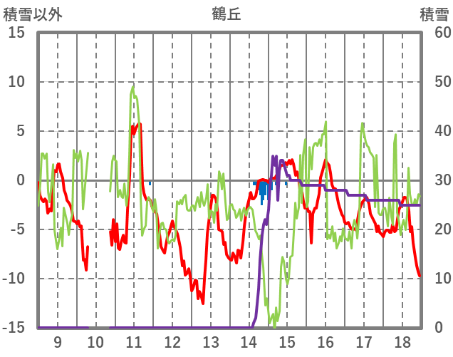 | 日 | 時 | 気温 | 降水 | 風向/風速 | 日照 | 積雪 | 降雪 |