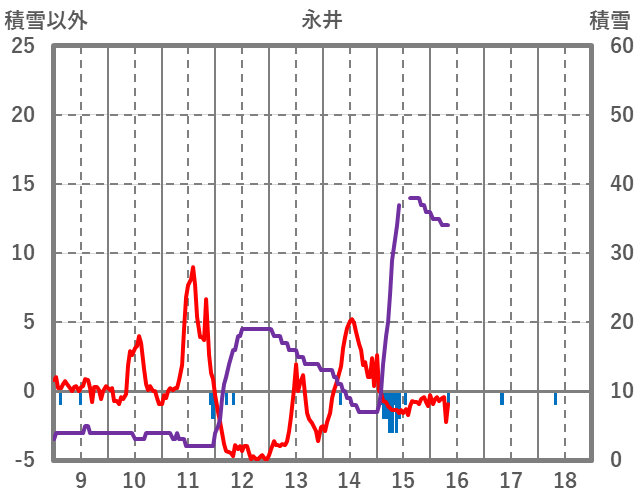 | 日 | 時 | 気温 | 降水 | 風向/風速 | 日照 | 積雪 | 降雪 |