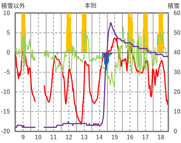 | 日 | 時 | 気温 | 降水 | 風向/風速 | 日照 | 積雪 | 降雪 |