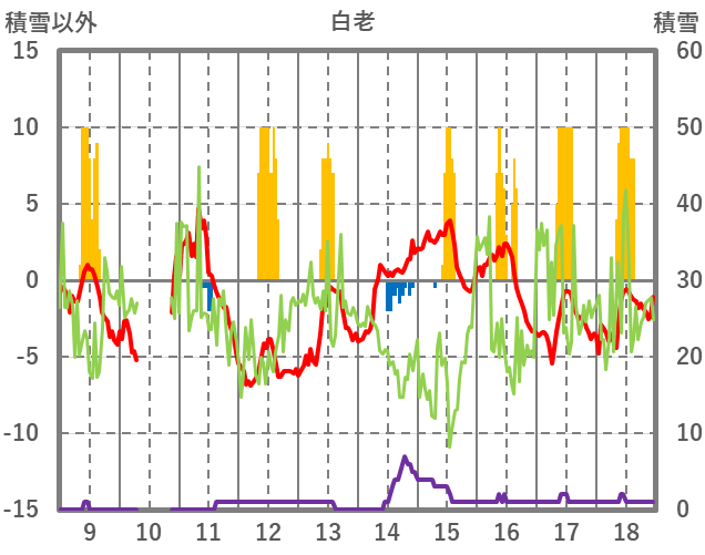| 日 | 時 | 気温 | 降水 | 風向/風速 | 日照 | 積雪 | 降雪 |