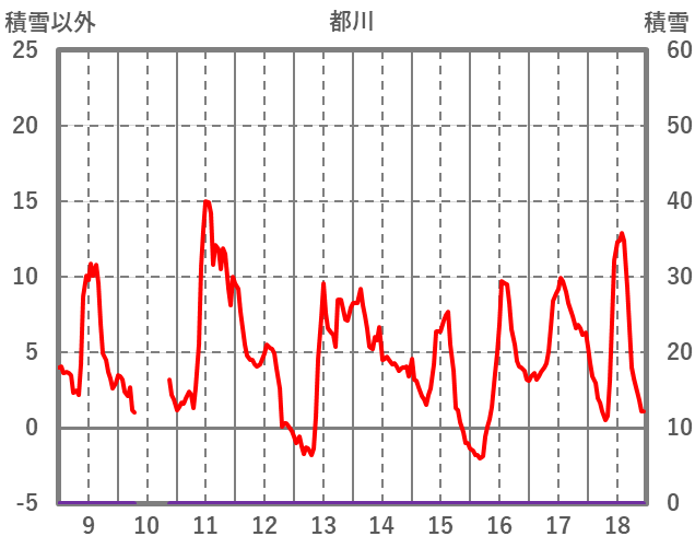 | 日 | 時 | 気温 | 降水 | 風向/風速 | 日照 | 積雪 | 降雪 |