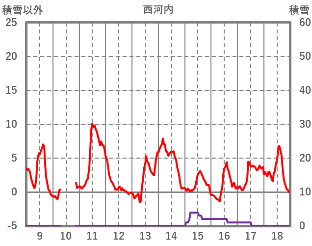 | 日 | 時 | 気温 | 降水 | 風向/風速 | 日照 | 積雪 | 降雪 |