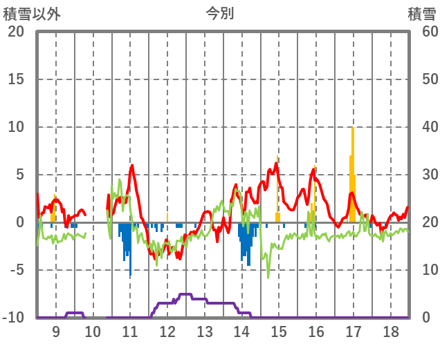 | 日 | 時 | 気温 | 降水 | 風向/風速 | 日照 | 積雪 | 降雪 |