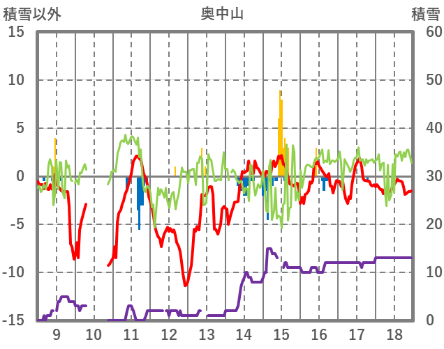| 日 | 時 | 気温 | 降水 | 風向/風速 | 日照 | 積雪 | 降雪 |