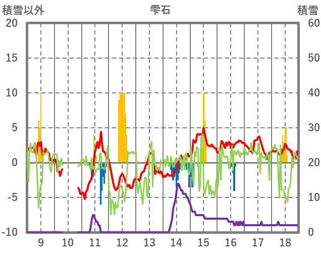| 日 | 時 | 気温 | 降水 | 風向/風速 | 日照 | 積雪 | 降雪 |