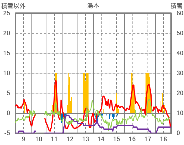 | 日 | 時 | 気温 | 降水 | 風向/風速 | 日照 | 積雪 | 降雪 |