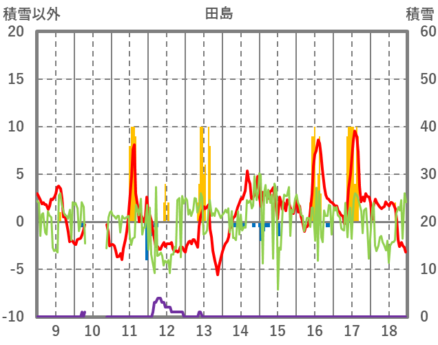 | 日 | 時 | 気温 | 降水 | 風向/風速 | 日照 | 積雪 | 降雪 |