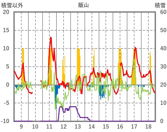 | 日 | 時 | 気温 | 降水 | 風向/風速 | 日照 | 積雪 | 降雪 |