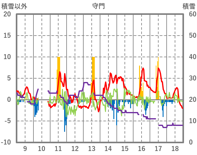 | 日 | 時 | 気温 | 降水 | 風向/風速 | 日照 | 積雪 | 降雪 |