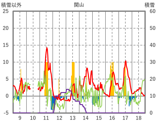 | 日 | 時 | 気温 | 降水 | 風向/風速 | 日照 | 積雪 | 降雪 |