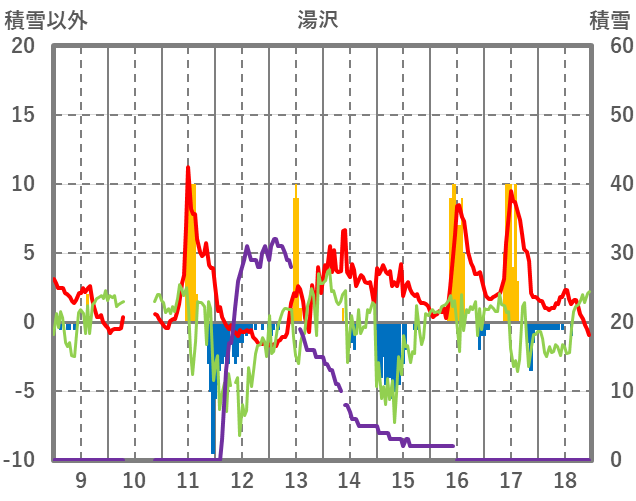 | 日 | 時 | 気温 | 降水 | 風向/風速 | 日照 | 積雪 | 降雪 |