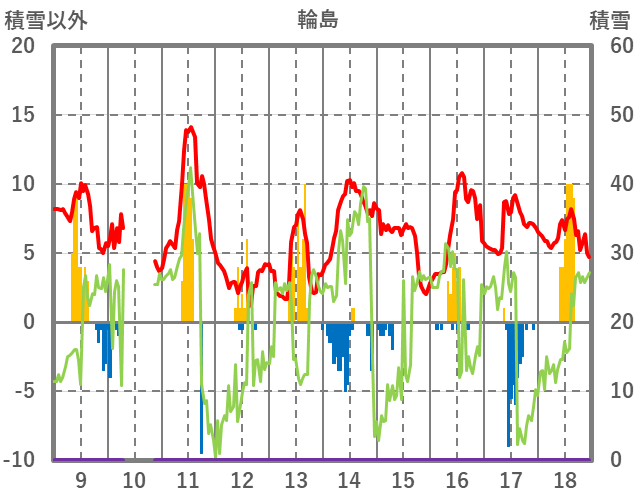 | 日 | 時 | 気温 | 降水 | 風向/風速 | 日照 | 積雪 | 降雪 |