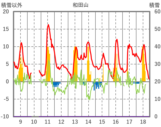 | 日 | 時 | 気温 | 降水 | 風向/風速 | 日照 | 積雪 | 降雪 |