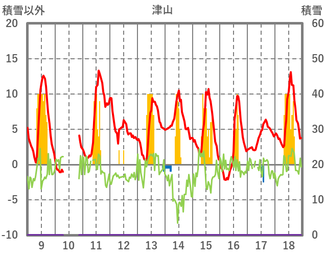 | 日 | 時 | 気温 | 降水 | 風向/風速 | 日照 | 積雪 | 降雪 |