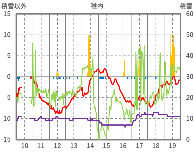 | 日 | 時 | 気温 | 降水 | 風向/風速 | 日照 | 積雪 | 降雪 |
