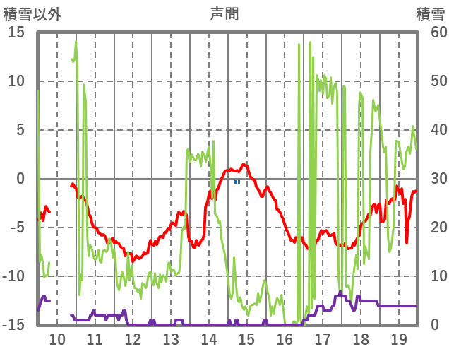 | 日 | 時 | 気温 | 降水 | 風向/風速 | 日照 | 積雪 | 降雪 |