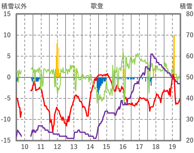 | 日 | 時 | 気温 | 降水 | 風向/風速 | 日照 | 積雪 | 降雪 |