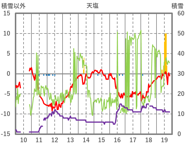 | 日 | 時 | 気温 | 降水 | 風向/風速 | 日照 | 積雪 | 降雪 |