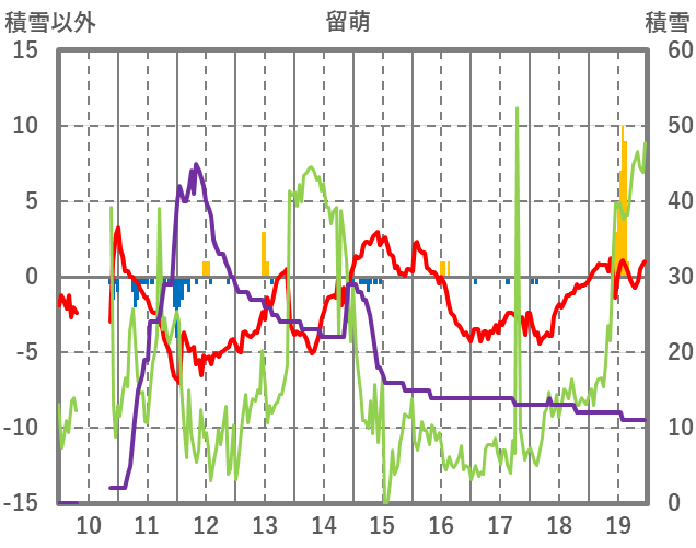 | 日 | 時 | 気温 | 降水 | 風向/風速 | 日照 | 積雪 | 降雪 |
