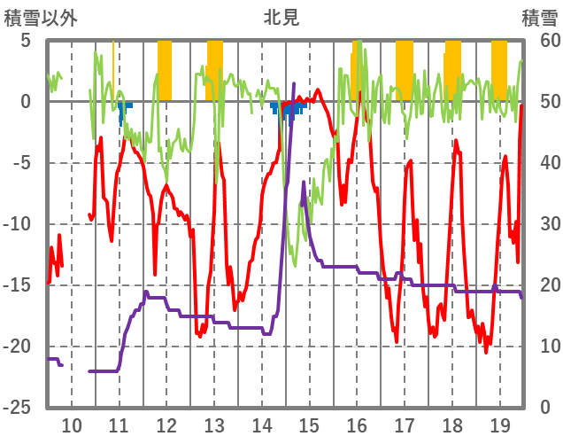 | 日 | 時 | 気温 | 降水 | 風向/風速 | 日照 | 積雪 | 降雪 |