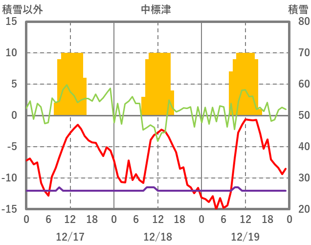 | 日 | 時 | 気温 | 降水 | 風向/風速 | 日照 | 積雪 | 降雪 |